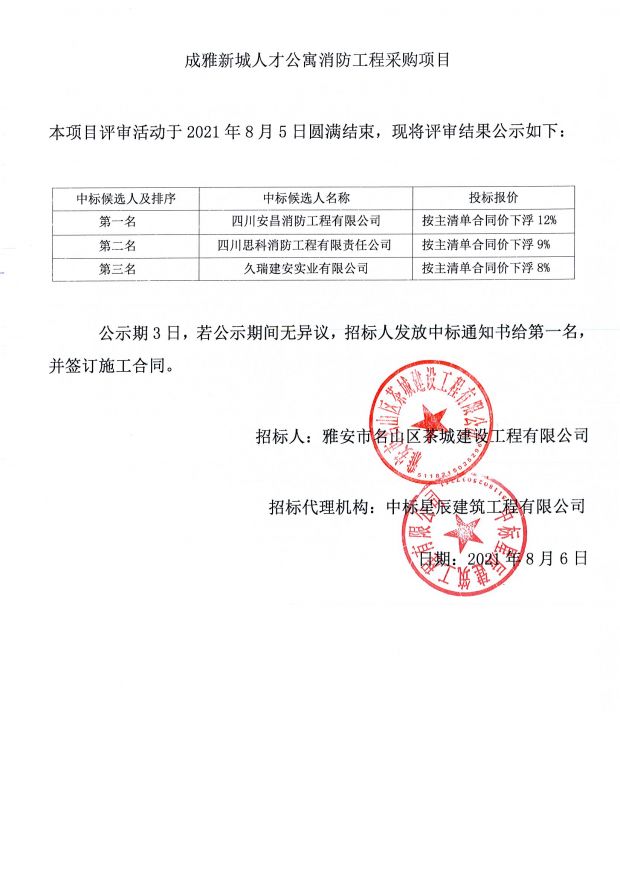 雅安市名山區馬嶺現代農業產業園建設項目一期消防專業分包采購項目招標結果公告...